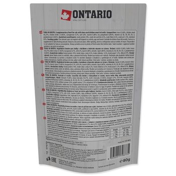 Složení: maso a výrobky živočišného původu, ryby a výrobky z ryb 71,33% (tuňák 41,06%, kuřecí maso 30,27%), kuřecí vývar 27,482%, karagenan 0,7%, sůl 0,4%, taurin 0,08%, extrakt z čaje 0,005%, vitaminy (A, B2, B3, B5, D3, E, polydextróza) 0,003%.