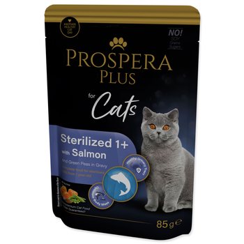 Kompletní a vyvážené krmivo pro kastrované kočky od 1 roku v podobě kapsičky s lososem a zeleným hráškem v omáčce.