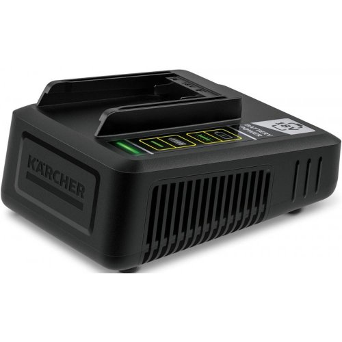 Duální rychlonabíječka dokáže nabíjet 2 baterie současně díky 2 slotům. Lze jej snadno připevnit na stěnu pomocí vestavěného nástěnného držáku. Rychlonabíječka nabije výměnné baterie Kärcher Battery Power 18 V/2,5 Ah na 80 % za pouhých 44 minut. Lze jej také použít k dobíjení všech ostatních 18V výměnných baterií na 18V bateriové platformě Kärcher