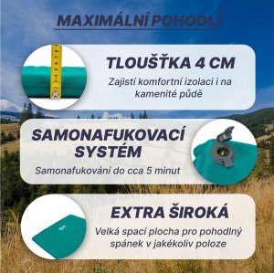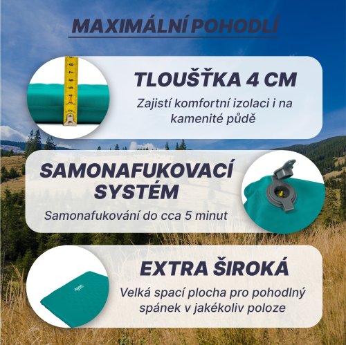 Stanujete rádi a chcete si zajistit pohodlné místo na spaní i v přírodě nebo v kempu? Prostorná samonafukovací karimatka Acra s tloušťkou 4 cm vám poskytne maximální komfort i na nerovném terénu.