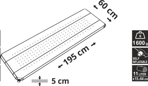 Při skládání samonafukovací karimatky se nejprve uvolní ventil a tlakem se vzduch vyhání ven, takže má rozměry zavazadla a lépe se přenáší. Tato světle modrá karimatka s šedým pruhem se skvěle hodí pro spací pytle typu mumie, které jsou nejrozšířenější zejména kvůli své sbalitelnosti, ale také se dá využít i ve spojení s dekovými či oválnými typy. Díky své délce 195 cm a šířce 60 cm je karimatka ideální i pro větší osoby.