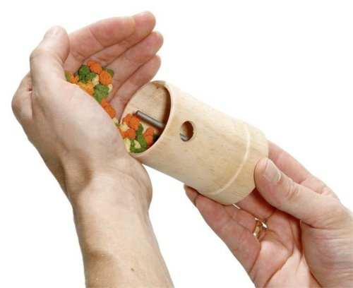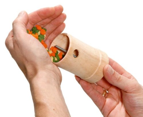 Přírodní dřevěný pamlskovník poslouží jako hračka k okusu. Váleček můžete naplnit pamlsky, bylinkami, zeleninou či jinými pamlsky. Hračka stimuluje zvíře k větší aktivitě a zabraňuje nudě. Rozměry: 6 × 11 cm