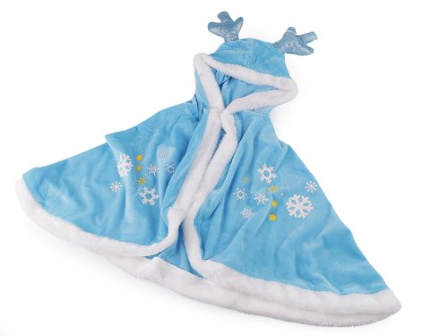 Karnevalový plášť pro malou ledovou královnu je měkký a velmi příjemný na dotek. Lemuje ho plyšová kožešinka, na kapuci jsou našité třpytivé rohy a pozoruhodným detailem je potisk sněhových vloček. Plášť se zapíná pomocí suchého zipu. Výška rohů je cca 11 cm.