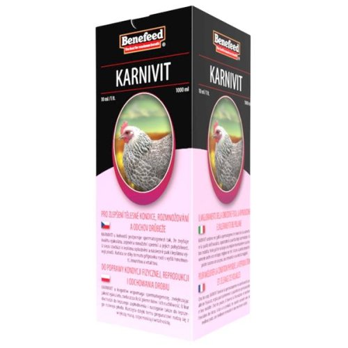 Pro zlepšení reprodukce a odchovu kuřat KARNIVIT obsahuje specifický komplex látek zlepšujících reprodukci drůbeže ve Vašem chovu. Všechny aktivní látky jsou ve formě, která zajistí maximální účinnost každé z nich. KARNIVIT u kohoutů podporuje spermatogenezi, protože zvyšuje kvalitu ejakulátu, zejména množství spermií a jejich pohyblivost. U slepic dochází k lepšímu oplodnění a následně pak i lepšímu vývoji plodů. Kuřata se díky KARNIVITu rodí s vyšší hmotností, imunitou a vitalitou, což se pozitivně projevuje na jejich zdravotním stavu a vývoji v dalším období jejich života. KARNIVIT je vhodné podávat mladým kuřátkám již po vylíhnutí, udržuje se tak jejich vyšší vitalita a imunita, což se projevuje na jejich menší úmrtnosti. KARNIVIT je možno také použít v případech, kdy je žádoucí zlepšit nárůst kosterního svalstva, jako je tomu např. v případě užitkových ptáků nebo ptáků pro výstavní nebo sportovní účely. Vysoká účinnost přípravku je dána speciální technologií výroby, kdy jsou aktivní látky obdukcí chráněny před degradací v žaludku a zažívacím traktu. Tento ochranný obal je postupně odbouráván až dojde k úplnému uvolnění aktivní látky v organismu v její maximální účinnosti. Významným přínosem této technologie je skutečnost, že je v roztoku vytvořena speciální nosná a izolační houbovitá mikrostruktura, která zamezuje ulpívání aktivních látek na stěnách rozvodu napájecí vody nebo v napáječkách. Tím se eliminuje hrozba namnožení nežádoucích organismů na těchto zbytcích a jejich následné roznášení všem zvířatům. Složení: L-karnitin vitamíny přírodní látky upravená pitná voda