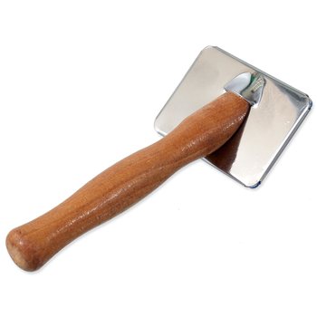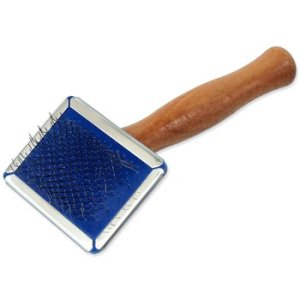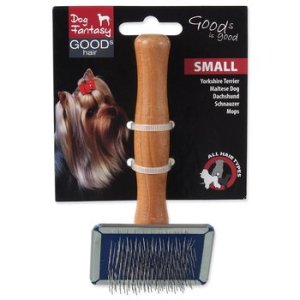 Kartáč s kovovými drátky a dřevěnou rukojetí pro menší psy.
