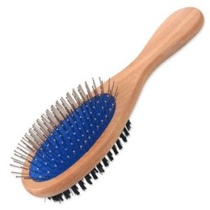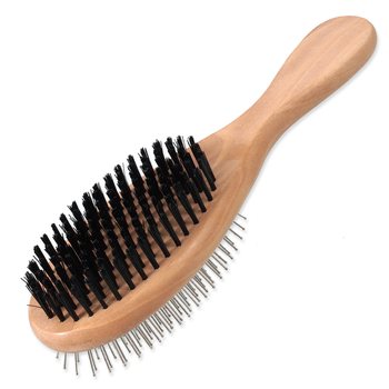 Oboustranný dřevěný kartáč. Strana s nylonovými štětinami pomáhá účinně odstraňovat nečistoty a uvolněnou srst.