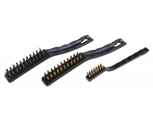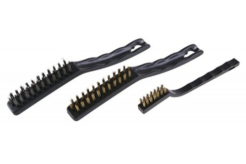 Sada tří kusů ručních kartáčů - plastový základ, 1 x ocelový drát a 2 x mosazný drát.