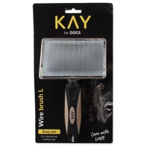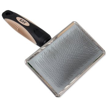 Jednostranný kartáč pro velké psy s příjemně tvarovanou plastovou rukojetí a jemnými drátěnými štětinami.