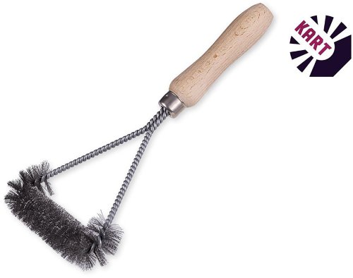 Ruční kartáč s dřevěnou rukojetí na čištění grilů, osazený nerezovým drátem o průměru 0,20 mm.