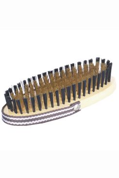 Dřevěný oválný kartáč na ruku s mosaznými drátky uprostřed je určený na úpravu srsti malých zvířat.