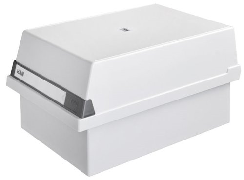 Kartotéka vyrobená z pevného plastu s gumovými nožičkami a odnímatelným víkem