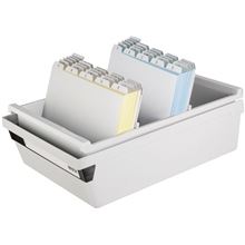 Kartotéka vyrobená z pevného plastu s gumovými nožičkami a odnímatelným víkem Formát A5 na šířku Rozměr 235 x 190 x 360 mm 2 dělicí desky bez abecedního rozlišovače Kapacita: pro 1 300 karet