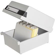 Kartotéka vyrobená z pevného plastu s gumovými nožičkami a odnímatelným víkem Formát A6 na šířku Rozměr 177 x 140 x 250 mm Popis 1 dělicí deska, celkem pro 800 karet