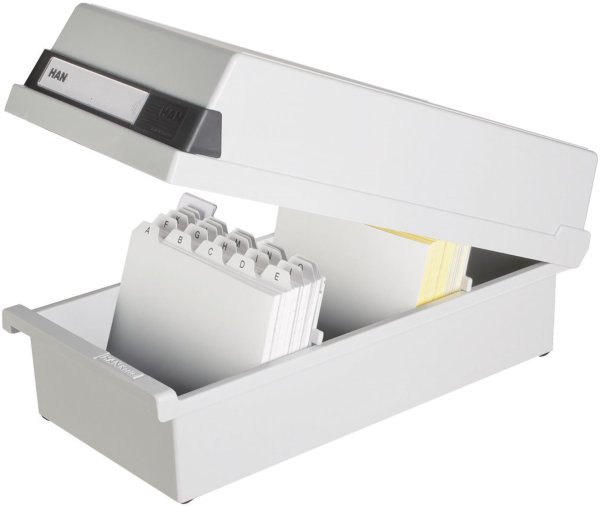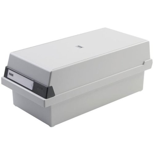 Kartotéka vyrobená z pevného plastu s gumovými nožičkami a odnímatelným víkem Formát A6 na šířku Rozměr 177 x 140 x 360 mm Popis 2 dělicí desky, celkem pro 1 300 karet