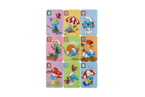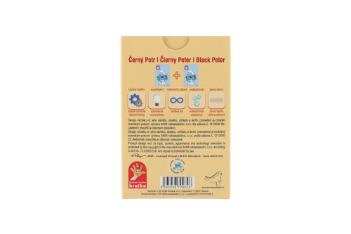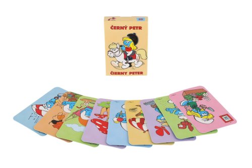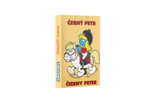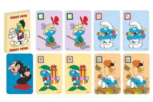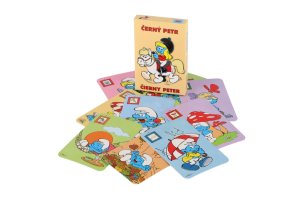 Dětské karty pro hru zvanou Černý Petr s obrázky Šmoulové. Krabička obsahuje i podrobný návod a karty mají na rubové straně mírně zdrsnělý povrch pro lepší manipulaci s nimi.