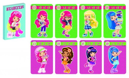 Dětské karty pro hru zvanou Kvarteto s obrázky Strawberry. Krabička obsahuje i podrobný návod a karty mají na rubové straně mírně zdrsnělý povrch pro lepší manipulaci s nimi.