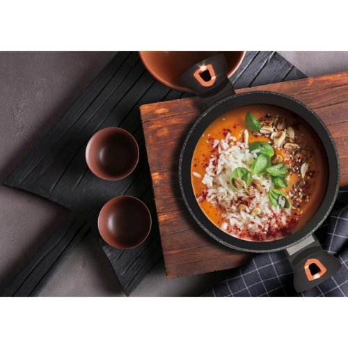 - materiál: kovaný hliník s mramorovým povrchem- průměr: 24 cm- výška: 11,8 cm- objem: 4,1 l- barva: černá/rosegold- žáruvzdorná poklice se silikonovým okrajem- 3vrstvý nepřilnavý povrch s mramorovým …