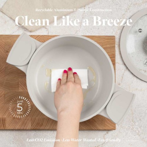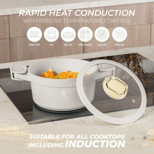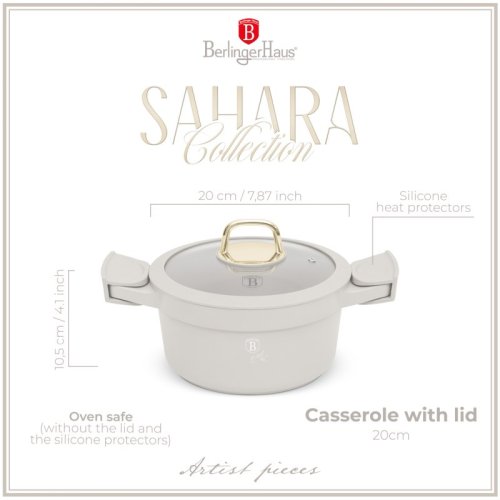 Elegantní kastrol z kolekce Sahara Collection s titanovým povrchem je ideálním pomocníkem pro každodenní vaření. S objemem 2,8 l a průměrem 20 cm je vhodný pro přípravu různých pokrmů. Skleněná poklice se silikonovým okrajem zajišťuje bezpečné vaření, zatímco odnímatelné silikonové rukojeti umožňují snadnou manipulaci. Kastrol je kompatibilní s indukčními, sklokeramickými, plynovými i elektrickými varnými deskami a je vhodný také pro použití v troubě.