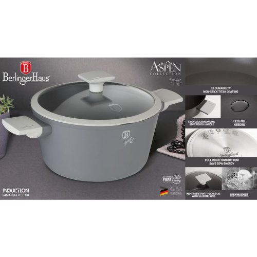 Univerzální kastrol s titanovým povrchem v šedém designu Aspen Collection. Moderní minimalistický design kastrolu vás jistě zaujme hned na první pohled. Matný šedý povrch kastrolu je navíc velmi praktický při dlouhodobém používání. Vnitřní vrstva je potažena 3vrstvým titanovým povrchem, který je charakteristický svou dokonalou nepřilnavostí. Připravované pokrmy se tak nepřipalují a díky tomu se kastrol velmi snadno čistí. Zároveň je vhodný pro zdravé vaření s minimem tuku nebo oleje, v závislosti na použitých surovinách klidně i bez jedinné kapky tuku. Titanový povrch, stejně jako ostatní použité materiály, neobsahují žádné škodlivé látky, vaření je tak zcela zdravé a hygienické. Zesílené Turbo indukční dno z nerezové oceli je kompatibilní se všemi druhy varných desek a spolehlivě funguje také na indukci. Jistě oceníte tepelně izolovanou rukojeť, která se při vaření nezahřívá a zůstává stále chladná. Kastrol Aspen je vhodný pro každodenní vaření, dušení i smažení, perfektně bude vypadat i při servírování hotových jídel přímo na váš stůl.