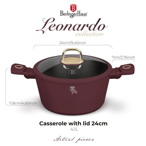 Luxusní kastrol z prémiové edice Leonardo kombinuje vysokou funkčnost s elegantním designem v černo-růžovo-zlatém provedení. Díky odolnému titanovému povrchu a praktickým doplňkům je ideální pro každodenní vaření i pečení.