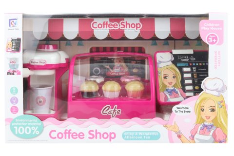 Velká kavárna s doplňky. Balení obsahuje kávovar, chladničku s dortíky a pokladnu. Napájení kávovaru na 2 AA baterie (nejsou součástí), chladničky na 3 AG13 baterie (jsou součástí a pokladny na 2 AAA baterie (jsou součástí). Rozměry balení cca 46 x 27 x 18 cm. Věk 3+