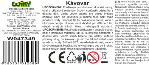 Kávovar s efekty. Velikost 16 cm. Světelné a zvukové efekty. Baterie 2xAA nejsou součástí balení. Přesné rozměry 13x9x16 cm.