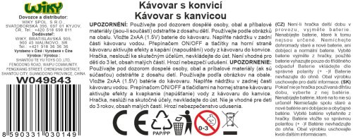 Kávovar s konvicí a tekoucí vodou. Rozměry 20x9x20cm. 2xAA baterie nejsou součástí. světelné a zvukové efekty. obsahuje kávovar, konvici a dva hrnečky. Po naplnění kávovaru vodou do nádržky nahoře vzadu kávovar napouští vodu do konvice. tlačítko on/off. Obrázkový návod na obalu.
