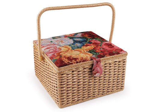 Velký čalouněný košík na šicí potřeby ocení každá švadlenka. Horní potah s květy připomíná gobelín. Na vnitřní straně víka má košík jehelníček a kapsu. Dále má k dispozici plastové mezipatro se spoustou přihrádek, do kterých si lze šicí potřeby uspořádat. Patro se dá snadno vyjmout. Výška mezipatra je 3 cm. Košík má zapínání na magnet. Díky kvalitnímu pevnému uchu jej můžete snadno přenést.