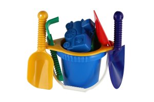 Plastová sada na písek. Sada obsahuje kbelík, sítko, lopatky, hrabičky a 2 bábovky. V síťce 20x28x12 cm. Vhodné od 12 měsíců.