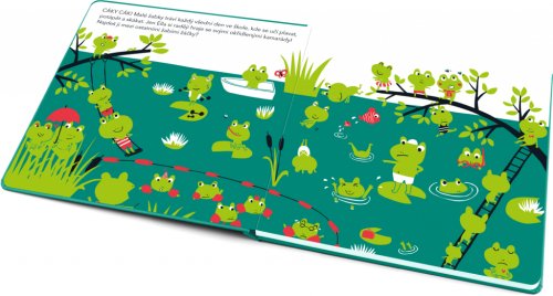 Tohle výjimečné leporelo plné roztomilých žabiček zaujme nejen jednoduchou moderní ilustrací a výraznými barvami, ale také tím, že není jen ke čtení a prohlížení jako většina ostatních. Hlavní hrdinka, žabka Ella, kterou děti najdou na každé dvojstraně, je totiž nádherně sametová. Odhalit ji mezi spoustou dalších žabek pouhým okem je velmi těžké, ale stačí pohladit stránky knihy rukou a Ellu snadno nahmatáte. Výborná zábava pro všestranný smyslový rozvoj dítěte!