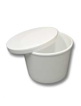 Lékárenský plastový kelímek s víčkem, o objemu 100 ml, vyrobený ze zdravotně nezávadných vstřikovaných plastů, určený zejména pro farmaceutický průmysl.