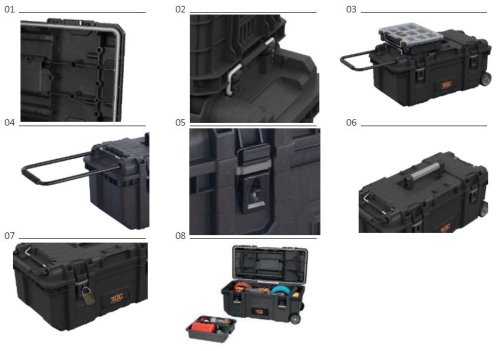 Mobilní box Keter ROC Pro Gear na kolečkách byl navržen i pro nejnáročnější uživatele. Je ideální pro domácí nadšence i profesionály. Pevná a speciálně navržená, odolná konstrukce umožňuje bezpečnou přepravu různých typů těžkých, objemných, či nestandardních nástrojů - vrtaček, šroubováků, vodovah atd. Chrání toto cenné vybavení před nárazy, prachem a vodou. Materiál je vysoce odolný vůči mechanickému poškození, což zajišťuje dlouhodobou trvanlivost výrobku. Box má zabudovaná kolečka a teleskopickou rukojeť. Box je vybaven přídavným těsněním, které účinně chrání obsah před vlhkostí a prachem. Mobilní box Keter ROC Pro Gear je kompatibilní s produkty 1.0 a 2.0 Pro Gear.