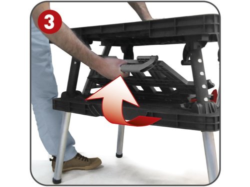Díky propracovanému systému skládání můžete stůl rychle rozložit a složit bez použití jakéhokoliv nářadí. Jeho kompaktní složená podoba a nízká hmotnost umožňují snadné přenášení, zatímco robustní konstrukce zajišťuje stabilitu při každém použití.