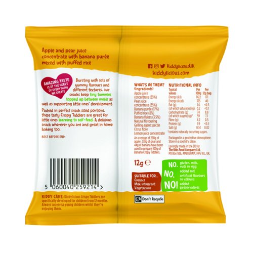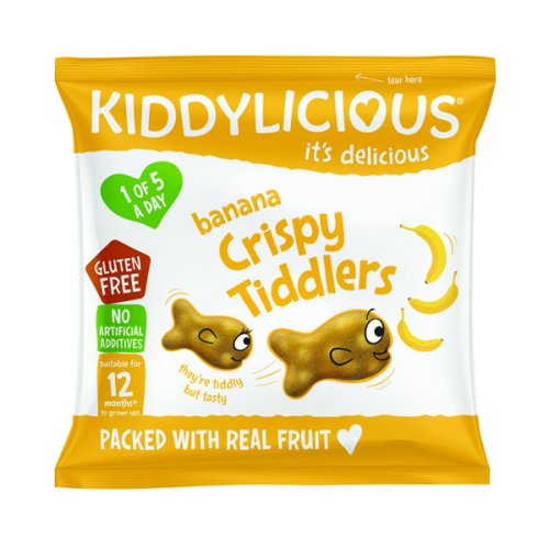 Banánové křupavé rybičky Kiddylicious jsou dokonalou a zdravou sladkostí. Jsou vyrobeny z pravého ovoce a ovocné šťávy, načež tuto směs rozmixujeme s křupavými kousíčky rýže a vytvarujeme je do rozkošného tvaru rybiček. Jsou chutnou alternativou ke gumovým medvídkům. Ideální i pro ozdobu koláčů, sušenek a dezertů. Naše křupavé rybičky obsahují pouze přirozeně se vyskytující cukry.