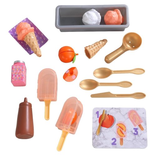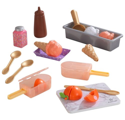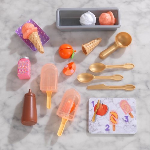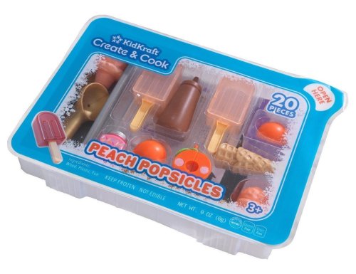Letní dobrota nikdy nevypadala tak chutně jako se sadou jídla KidKraft Create +amp; Cook™: Broskvové nanuky. Naučte děti vyrábět skvělé zmrzliny s ovocem. Karta s receptem slouží zároveň jako prkénko na krájení. Nakrájejte plátky broskve a vložte je do průhledných formiček na nanuky. Nebo si naberte broskvovou či vanilkovou zmrzlinu. Doplňte předstíraným posypáním a čokoládovou omáčkou. Mňam! Sada obsahuje 20 dílků. Vhodné pro děti od 3 let.