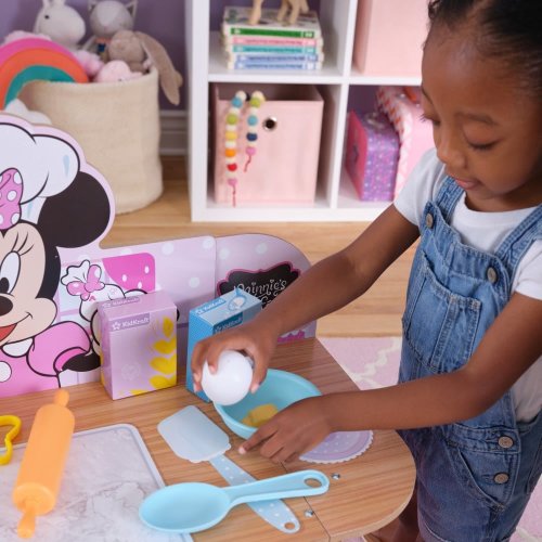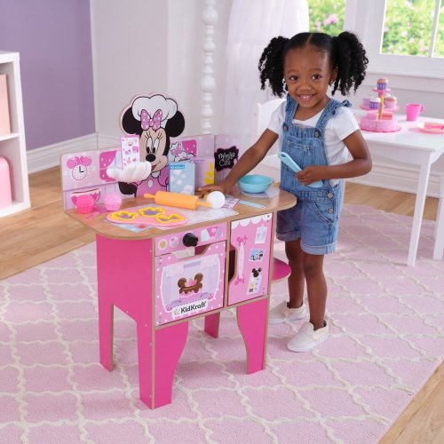 Myška Minnie je připravena podat pomocnou ruku a připravit nějaké sladké dobroty v této růžové hrací kuchyňce od KidKraft. Minnie Mouse kuchyňka umožňuje kuchařům vyzkoušet si pečení, válení těsta, vykrajování sušenek a vaření v troubě. Ruka myšky Minnie v bílé rukavici slouží jako polička na kartičku s receptem. Díky otočným knoflíkům a spotřebičům, které se otevírají a velkému pracovnímu prostoru, si děti užijí spoustu zábavy.