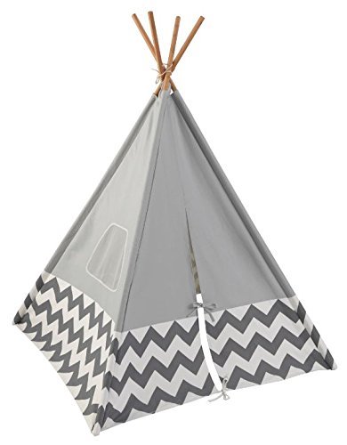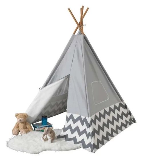 Decentní design v bílo-šedé kombinaci ze stanu dělá ideální doplněk nejen dětského pokoje. Teepee je vyrobeno z plátna a bambusových sloupků.