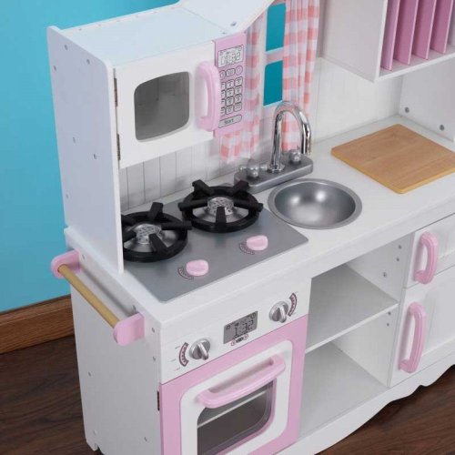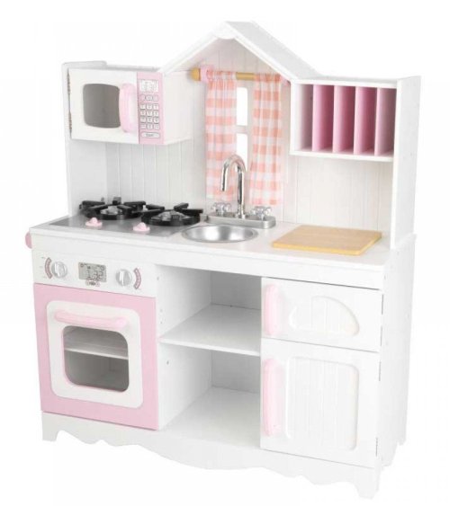 Bílo-růžová kuchyně od KidKraftu je vyrobena z kvalitního dřeva a stane se oblíbenou hračkou i Vašeho dítěte. Soustavu tvoří odolný kulatý dřez s baterií, trouba s plotýnkami a mikrovlnná trouba s okýnkem ve dvířkách.