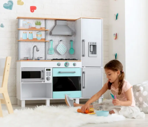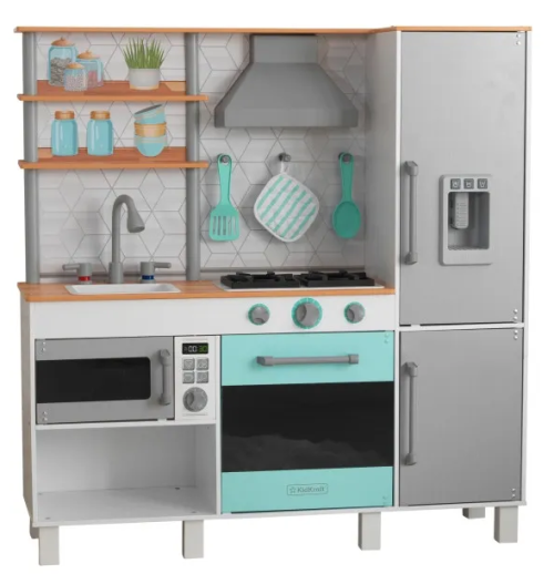 kuchyňka má prostornou lednici s možností výroby ledu, velkou mrazničku a mikrovlnu s průhlednými a otevíracími dvířky mimořádně velká trouba a sporák, u kterého lze otáčet knoflíky součástí je dřez, u kterého se děti mohou naučit rozpoznávat horkou a studenou vodu podle barvy kohoutku lžíce, špachtle a chňapka mají vlastní háčky nad varnou deskou prostorné police nad dřezem usnadňují organizaci skladování technologie EZ Kraft Assembly ™ usnadňuje skládání kuchyňky rozměry kuchyňky: 101 x 33 x 105 cm vhodné pro děti od 3 let