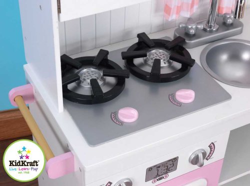 Sestava dětské kuchyňky zahrnuje sporák, pečící a mikrovlnou troubu, dřez, dvě úložné skříňky a poličky. Všechna dvířka kuchyňky lze snadno otevírat a zavírat. Povrchový materiál je snadno udržovatelný. - knoflíky u sporáku se otáčejí a při pohybu cvakají - dřez lze jednoduše vyjmout pro snadné udržení čistoty - otočné kohoutky u dřezu - pečící a mikrovlná trouba mají průhledná dvířka - držák na pírové utěrky - záclonky - kuchyňka je dostatečně velká, aby si s ní mohlo hrát i několik dětí současně - bezpečné zaoblané hrany - vyrobeno z MDF, látka - velmi odolná a pevná konstrukce - dodáváno s přehledným montážním návodem - rozměry: 96 výška x 80 šířka x 30 hloubka cm - váha 21kg