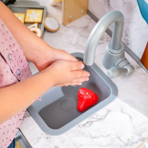 Efektivní kuchyňka Surprise Sweet z robustního dřeva nabízí nekonečné nápadité možnosti hraní. Za její pomoci můžete péct a zdobit nejrůznější dobroty! Pokud například naplníte zdobící sáček trochou vody a přiložíte jej na vrch sladkého pečiva budete svědky kouzla! Dříve bílý povrch ukáže svou skrytou barvu! Kuchyňka je dále opatřena úložnými prostory, praktickými kolíky pro úchyt náčiní, boční servírovací policí a umyvadlem s otočným kohoutkem. Hlavní vlastnosti: chladnička a trouba se snadno uchopitelnými rukojeťmiumyvadlo s otočným kohoutkemsada obsahuje 32 jídel, pánev, podnos a nádobí Dokumentace: návod k sestavení