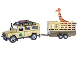 Hurá do Afriky na zebry a žirafy s bezpečným autem Land Rover Defender. Auto je kovové, 14cm dlouhé a na zpětný chod. Jeho součástí je odpojitelný přívěs o velikosti 14cm k přepravě zvířat.