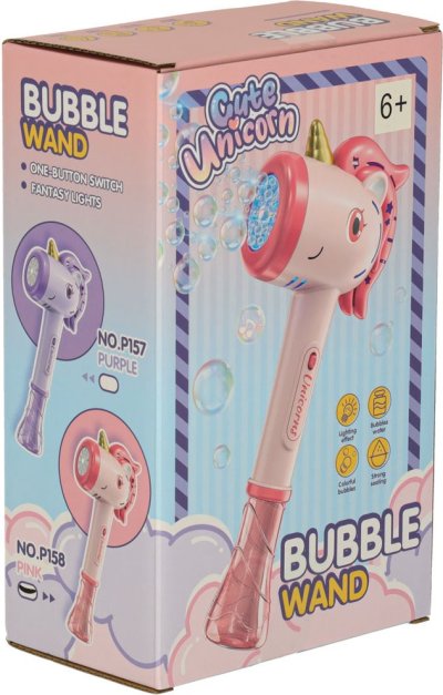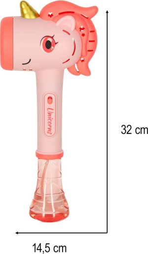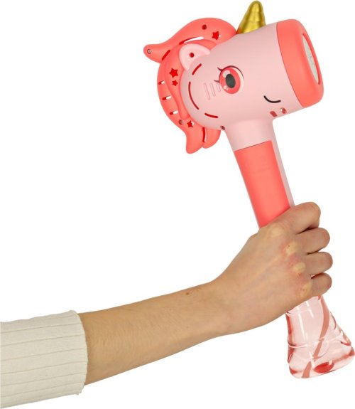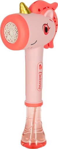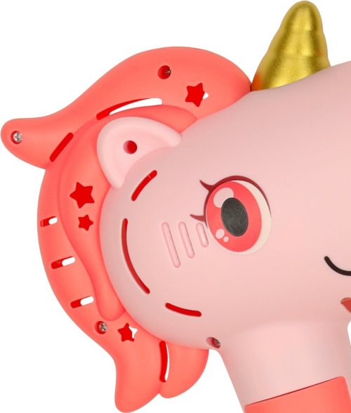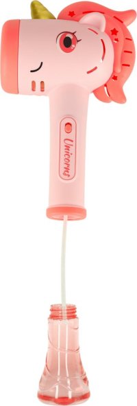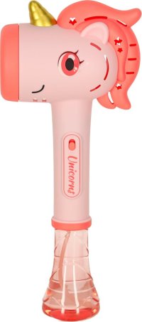 Zábavný přenosný stroj na výrobu bublin ve tvaru jednorožce! Nalijte bublifuk do přístroje, zapněte a užívejte si, kolik krásných duhových bublin jednorožec dokáže vytvořit.