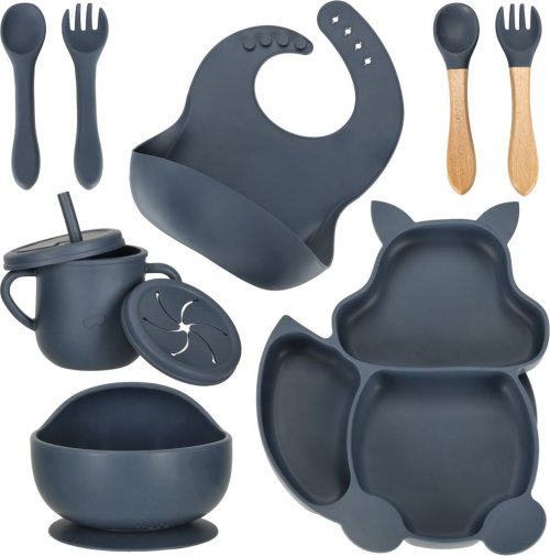Devítidílná sada silikonového nádobí pro děti je ideální způsob, jak se naučit samostatně jíst.