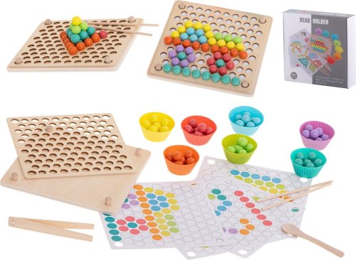 Sada se skládá z barevných dřevěných korálků, které se umísťují na dřevěné panely pomocí lžíce, pinzety nebo hůlek. Balení obsahuje:
