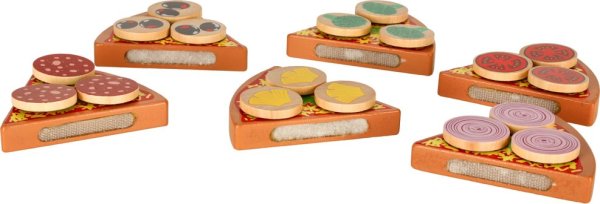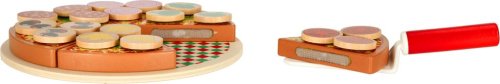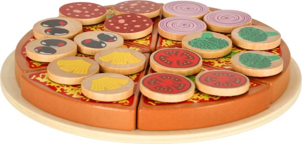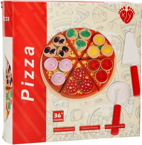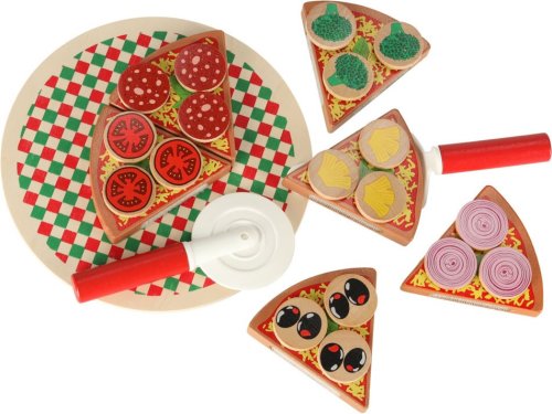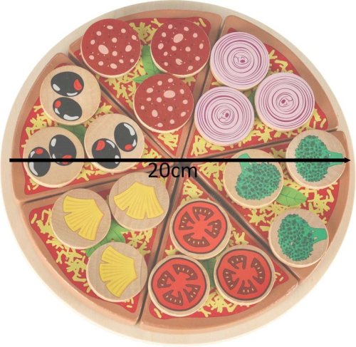 Sada pro zdobení vlastní pizzy. Hračka je vyrobena výhradně ze dřeva. Jednotlivé dílky pizzy lze spojovat pomocí přiloženého suchého zipu. Skvělá hračka, která jistě potěší malého kuchaře. Díky spojení dílků na suchý zip lze pizzu krájet přiloženým nožíkem. Hra pozitivně ovlivňuje rozvoj manuálních dovedností dítěte. Podporuje kreativní myšlení a tvořivost. Vaše dítě si bude moci pizzu ozdobit podle vlastní chuti.