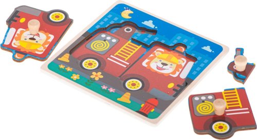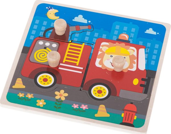 Dřevěná vkládačka s obrázkem hasičského vozu. Dílky se od sebe tvarově liší, což znamená, že by s jejich přiřazením neměli mít problém ani ti nejmenší.