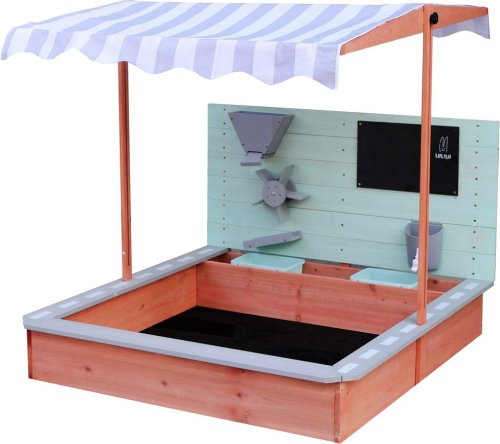 Vyrobeno z impregnovaného smrkového dřeva, praktická a nastavitelná stříška, lavičky k sezení, doplňky pro ještě větší zábavu – mlýnek, kohoutek, tabule a úložné boxy, jednoduché sestavení.