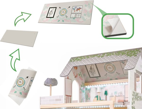 Moderní vzhled. Tři patra s prostornými pokoji (kuchyň, koupelna, obývací pokoj, ložnice) a terasou. Z patra do patra vede schodiště. Vybaven miniaturním nábytkem ze dřeva . Osvětlen pomocí LED pásků . Dřevěné části byly vyrobeny tak, aby se dětem při hře nedostaly do rukou třísky. Domeček zaručí nejen zábavu, ale bude i skvělou dekorací do dětského pokoje.