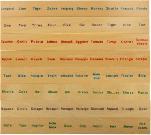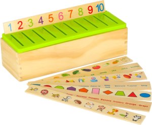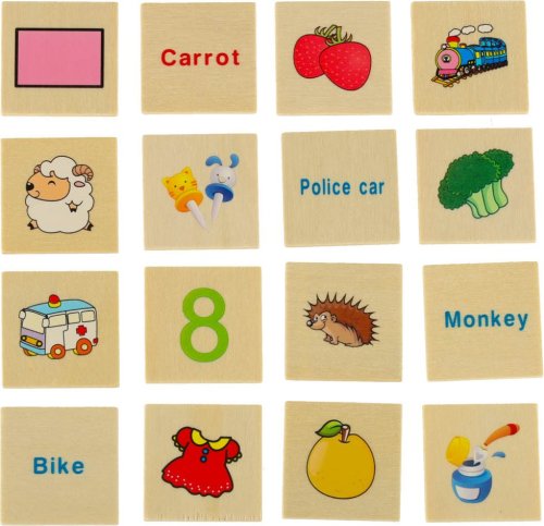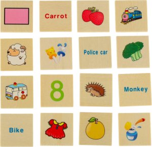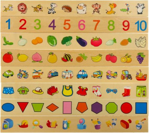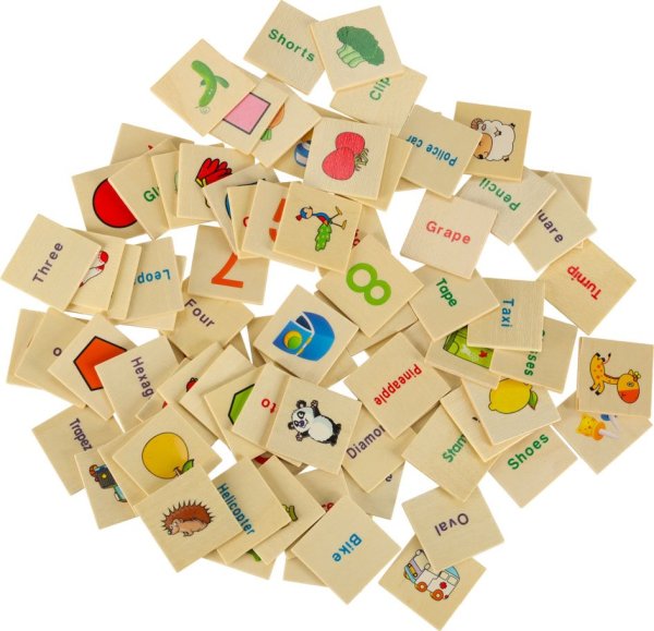 Hra spočívá v tom, že dítě vhazuje malé destičky s obrázky do otvorů odpovídajících velkým deskám, na kterých jsou stejné obrázky. Každý otvor představuje jiný motiv – číslo, tvar, zvíře nebo předmět. Hra rozvíjí logické myšlení, rozpoznávání tvarů, jemnou motoriku, koordinaci ruka-oko, paměť, soustředění, základní znalosti o číslech, tvarech, zvířatech a předmětech a základy anglického jazyka (všechny destičky jsou popsány anglickými názvy). Díky dřevěnému provedení a hladce obroušeným hranám je zcela bezpečná – nehrozí třísky ani poranění. Balení obsahuje: dřevěnou krabičku s víkem, 8 velkých destiček (každá s 10 obrázky) a 80 malých destiček s jednotlivými obrázky.